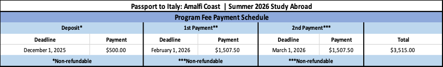 Passport to Italy: Amalfi Coast Program fee - $3,515.00 (see table for deadlines)