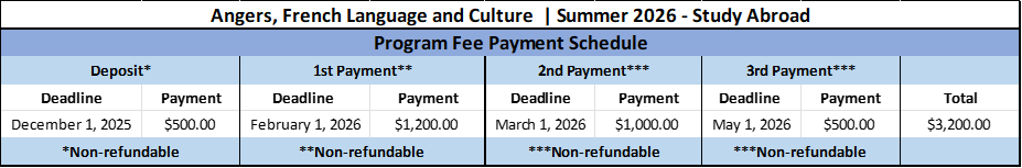 The cost of the four-week program is $3,200. The program cost includes homestay with French families, all breakfasts and five dinners per week, three weekend excursions to sites of historical and/or cultural importance in Western France, pre-departure and in-country orientation sessions, International Health Insurance. The program cost does not include the non-refundable Study Abroad Fee ($195), FIU tuition for six academic credits, travel between USA and Angers France, and lunches.
