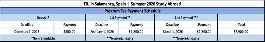 The cost of the four-week program is $2,900 and includes housing and all meals at the ANRO student residence, cultural activities in Salamanca, entrance fees to historical sites during field trips, private transportation for all excursions, round-trip airport transfers in Spain, and health insurance for the duration of the program. The cost does not include the non-refundable Study Abroad Fee ($195), FIU tuition for six academic credits, or international airfare.