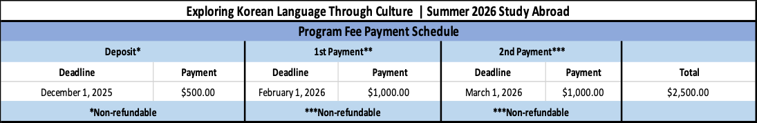 Korea Study Abroad Program fee - $2,500.00 (see table for deadlines)