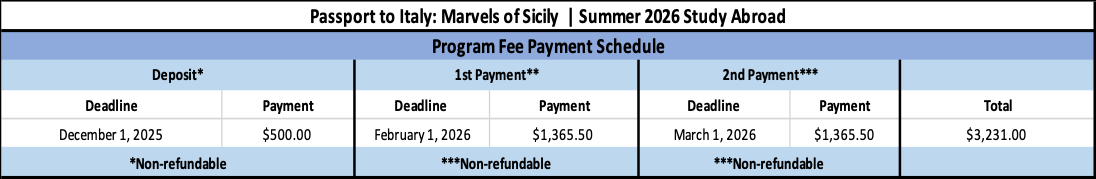 Passport to Sicily Program fee - $3,231 (see table for deadlines)